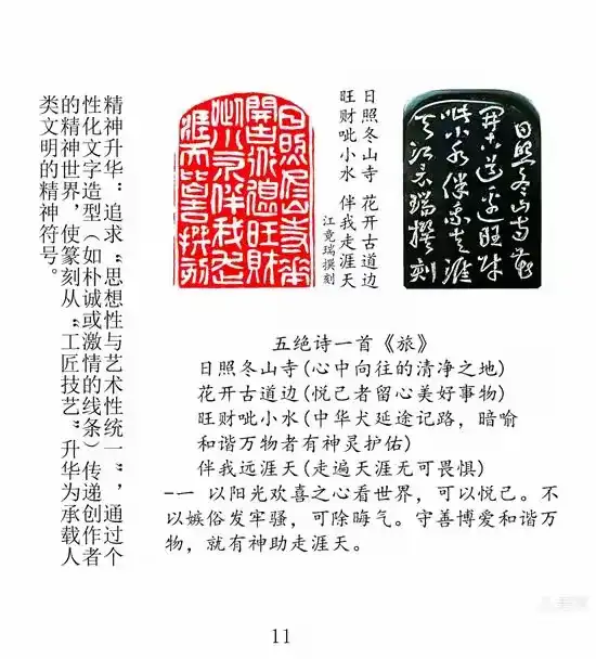这种美学突破的本质,是“形式与内容”的深度融合:竖线为“史”,文字为“道”。当他以自撰文辞书写当代哲思,以经典名句叩问文明内核时,篆刻便从“技艺展示”升华为“思想表达”。江竟瑞“朴诚或激情地演绎文字造型”,既坚守古玺汉印气象,又与时俱进彰显人类文明精华,使丹册篆刻成为“载道抒情”的艺术载体。