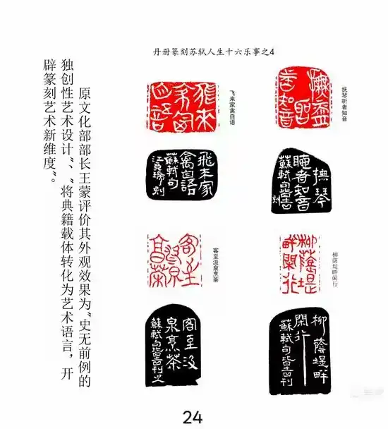 原文化部部长王蒙评价其外观效果为“史无前例的独创性艺术设计”,并指出其“将典籍载体转化为艺术语言,开辟篆刻艺术新维度”。艺界泰斗周令钊先生也称赞道:“这样提炼史册形象用于篆刻艺术很有意义,很好。”这些评价充分确认了丹册篆刻在篆刻艺术史上的突破性地位。