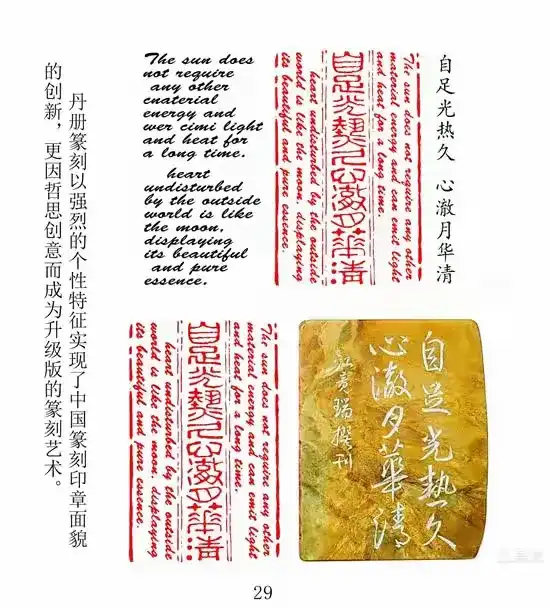 这种超越性让丹册篆刻从“民族的”变为“世界的”。通过引用西方哲言(如“认识自我”)直接显现全人类思维语境,让“史册格”串联古今中外智慧,并通过中外文字并用,使刀笔间文字承载文明的重量,已具备“人类文明证物”的潜质。从河北美术出版社《江竟瑞篆刻作品赏析》出版,到2016年民族文化宫书画篆刻展、2023年入编《荣宝斋·特刊》、2025年荣登红墙杂志《中华英才》和央视《大国品牌》,江竟瑞的实践印证了丹册篆刻的学术高度与文化价值。