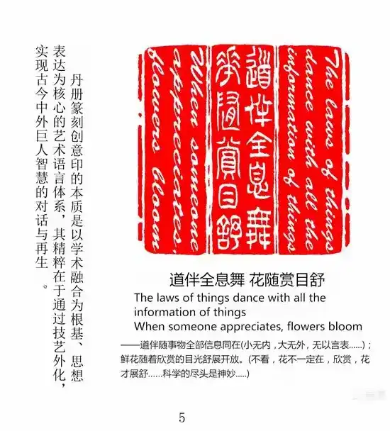 江竟瑞丹册篆刻的价值,不仅在于技法突破,更在于以东方智慧回应全球命题。比如他一印文——“道伴全息”,一语道破事理(真理)与事物的关系——是完全融和一体的,事物的全息小无内、大无外,人类语言和图示无以表达完整,只能是出于特定用途,居于特定时空、立场和角度来摘要立说,语言文字和图示系统就裹挟着无限的隐形元素,绝不等于事物和事理本身。——江竟瑞的这句“道伴全息”就是融合了传统道家“道法自然”的哲学观与现代“全息”理念,强调宇宙万物在“道”的统摄下浑然一体、动态共生的状态。这不仅是一种崭新的哲学观,更是一种认知方法论,它邀请我们以更开放、更整体的方式去理解和参与这个世界。——可以说,江竟瑞是以“非遗传承师”的身份打破了“匠人”的局限,以“哲人”的视野重构了篆刻的价值维度。“爱读巨人书,关注前沿说”的跨界修养,让他成为连接古今中外的“文化中介”。